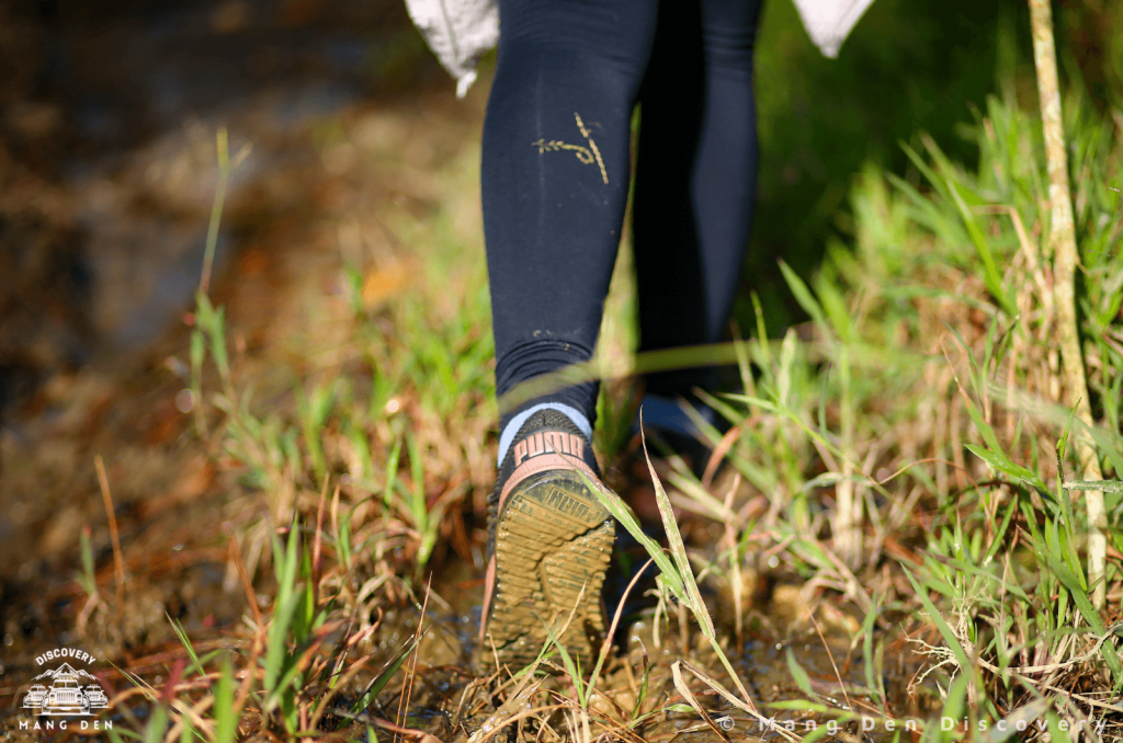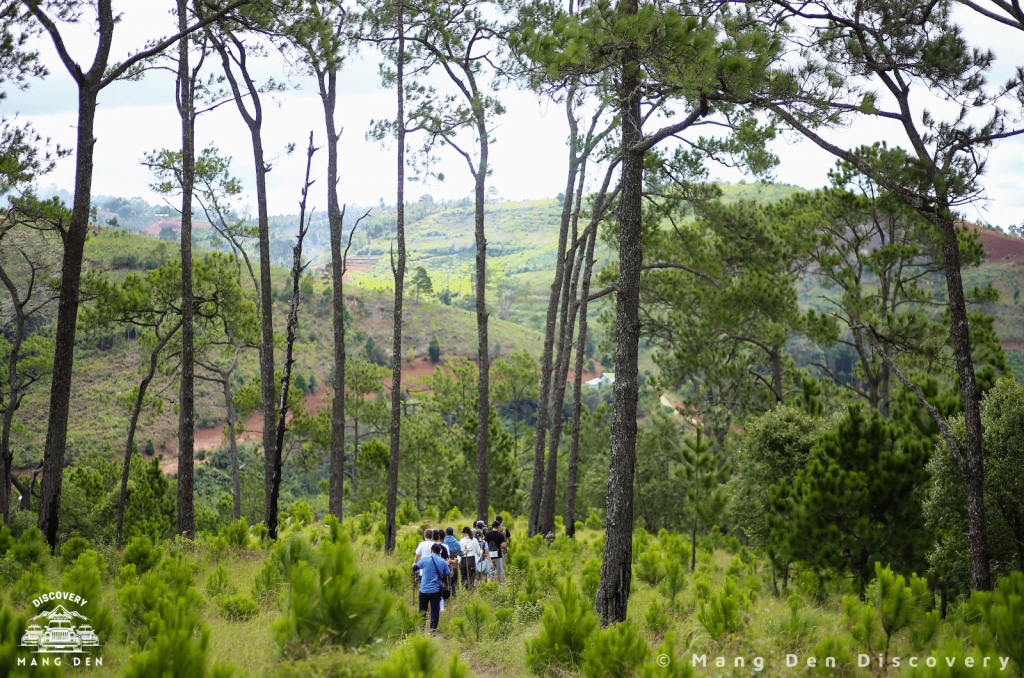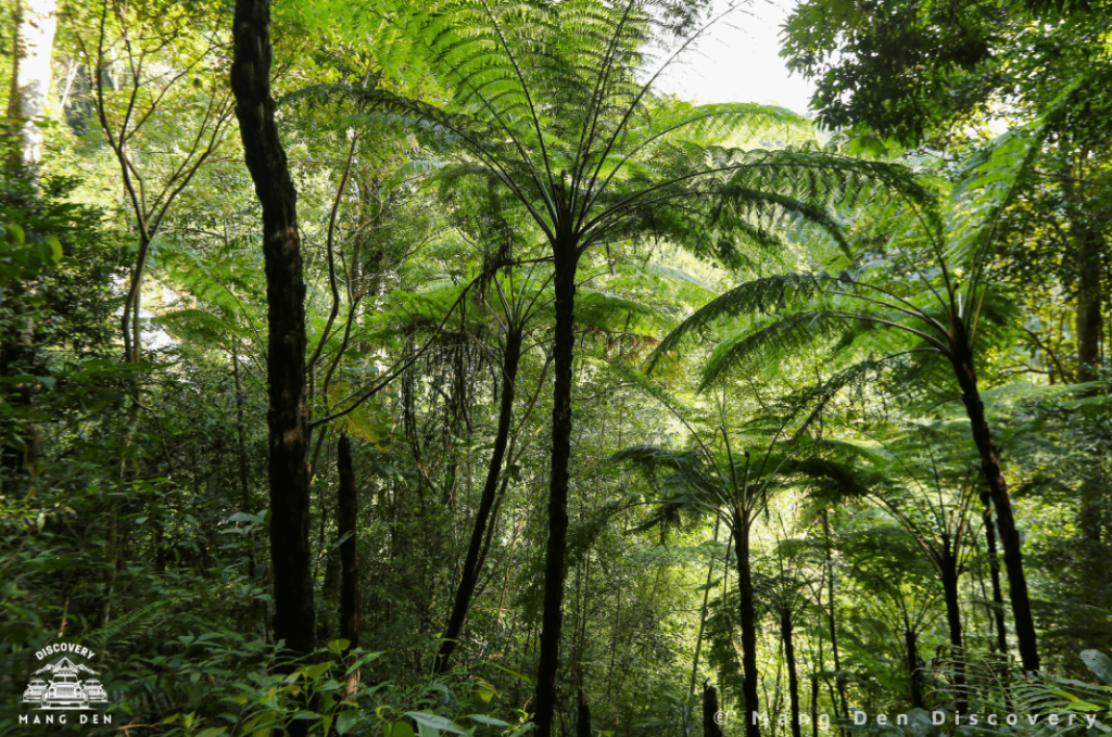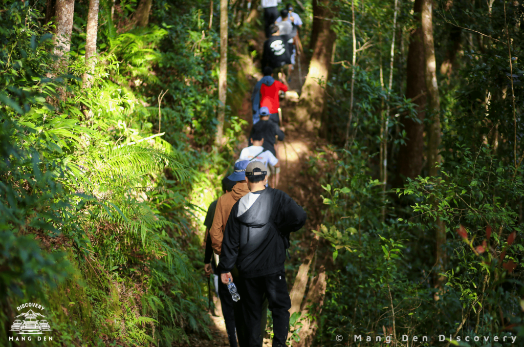 Với tổng chiều dài của đoạn trekking khoảng 5km, chúng mình thường đi mất 3 tiếng đồng hồ. Con đường trekking sẽ dẫn bạn qua những rừng thông cao vút, những thảm thực vật đa dạng, những rừng dương sỉ cổ thụ và những rừng cây nguyên sinh khổng lồ, đôi khi bạn phải băng qua suối để tiếp tục cuộc hành trình. Rừng ở Măng Đen vẫn nổi tiếng với vắt và ruồi vàng nên bạn nên mang theo các loại kem hoặc xịt chống côn trùng hoặc bôi nước muối để chống vắt nhé. Càng lên đến đỉnh thì con đường càng trở nên dốc và không khí càng trở nên loãng hơn, bạn nên mang theo đủ nước và một số thực phẩm bổ sung đường huyết nhanh. Trong những lần đi trước của bọn mình, một số bạn đã bị tụt đường huyết khi lên đến đây.