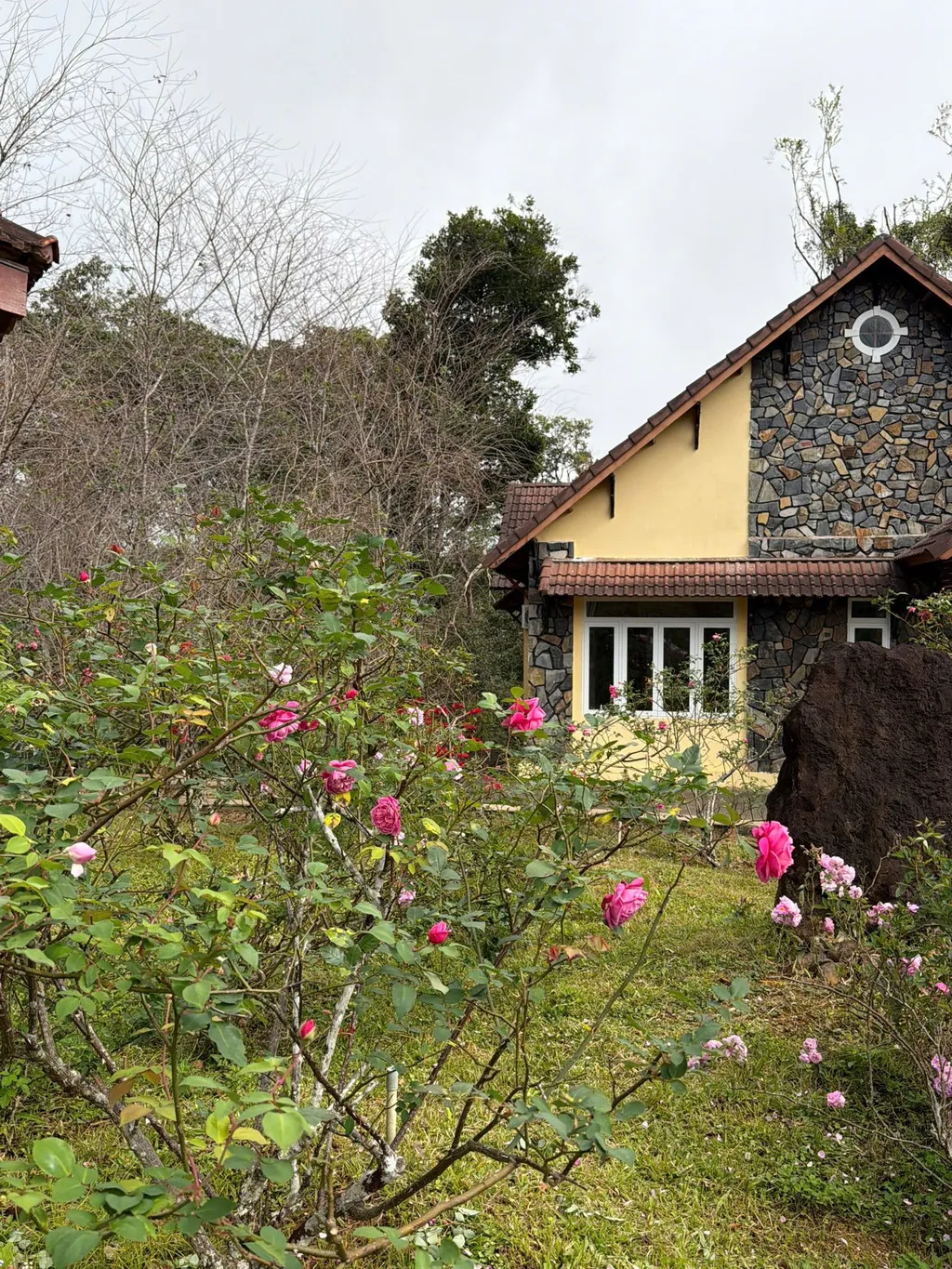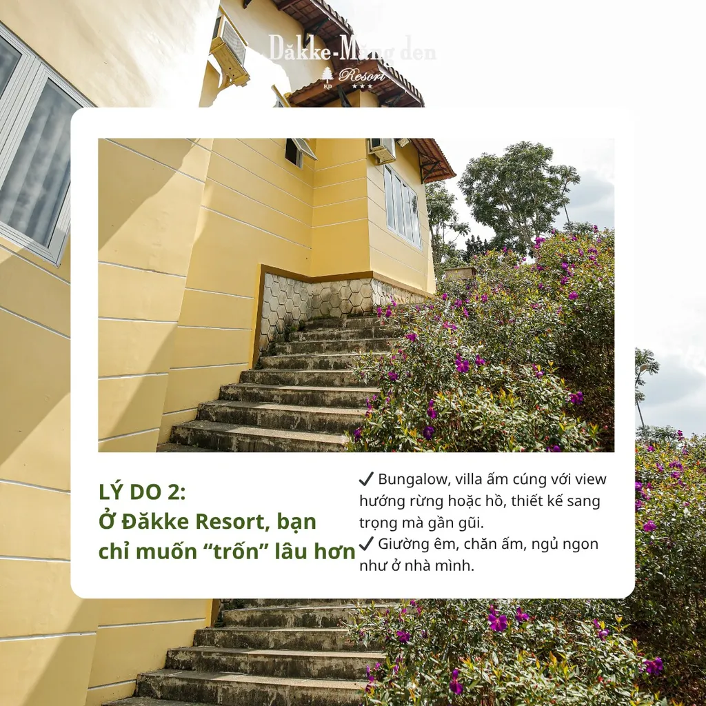 Bộ ảnh anh gửi giúp nhìn khá rõ hai lớp không gian. Một lớp là villa vàng, mái dốc, vườn hoa, tạo cảm giác nghỉ dưỡng kiểu truyền thống. Lớp còn lại là các bungalow nằm trong cây, hợp người muốn cảm giác riêng tư hơn. Điều này làm Dakke không bị một màu. Nếu đi gia đình, bạn sẽ dễ nghiêng về villa. Nếu đi đôi hoặc thích không gian tách hơn, bungalow đáng để nhìn kỹ.