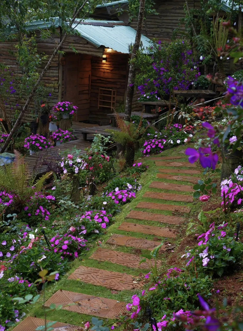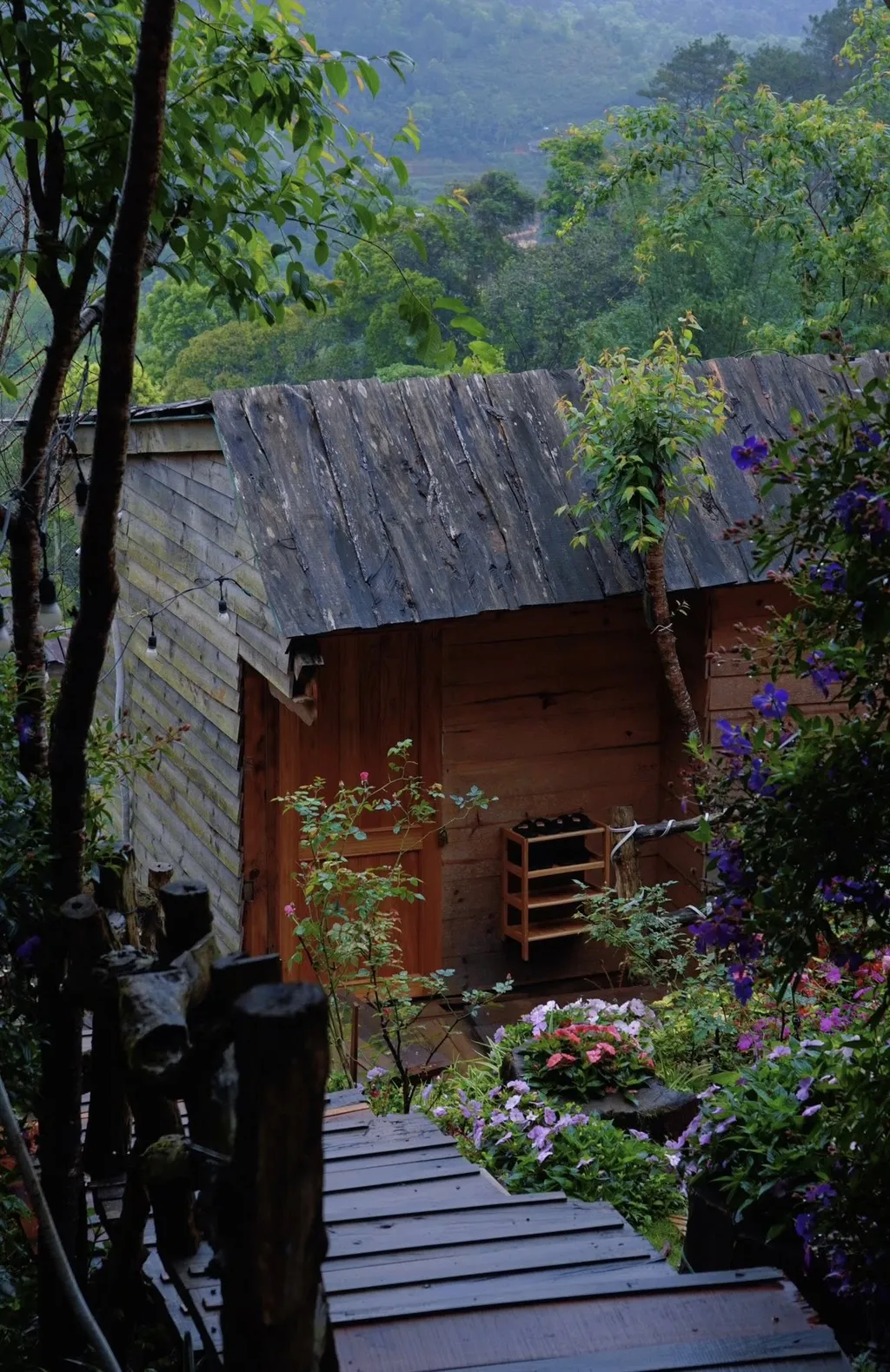 T’Rưng là kiểu nơi ở mà chỉ cần nhìn ảnh thôi đã thấy rõ cá tính: mặt tiền gỗ đậm chất cao nguyên, những căn bungalow tách xuống triền dốc, lối đi nhỏ giữa vườn hoa, và phía trước là khoảng trời đủ rộng để bạn nhìn mây tràn qua thung lũng. Nó không chạy theo kiểu sang bóng như khách sạn, cũng không cố làm quá nhiều thứ để chiều lòng tất cả. Điểm hay của T’Rưng là giữ được cảm giác mộc, ấm và có chút lãng mạn rất riêng.